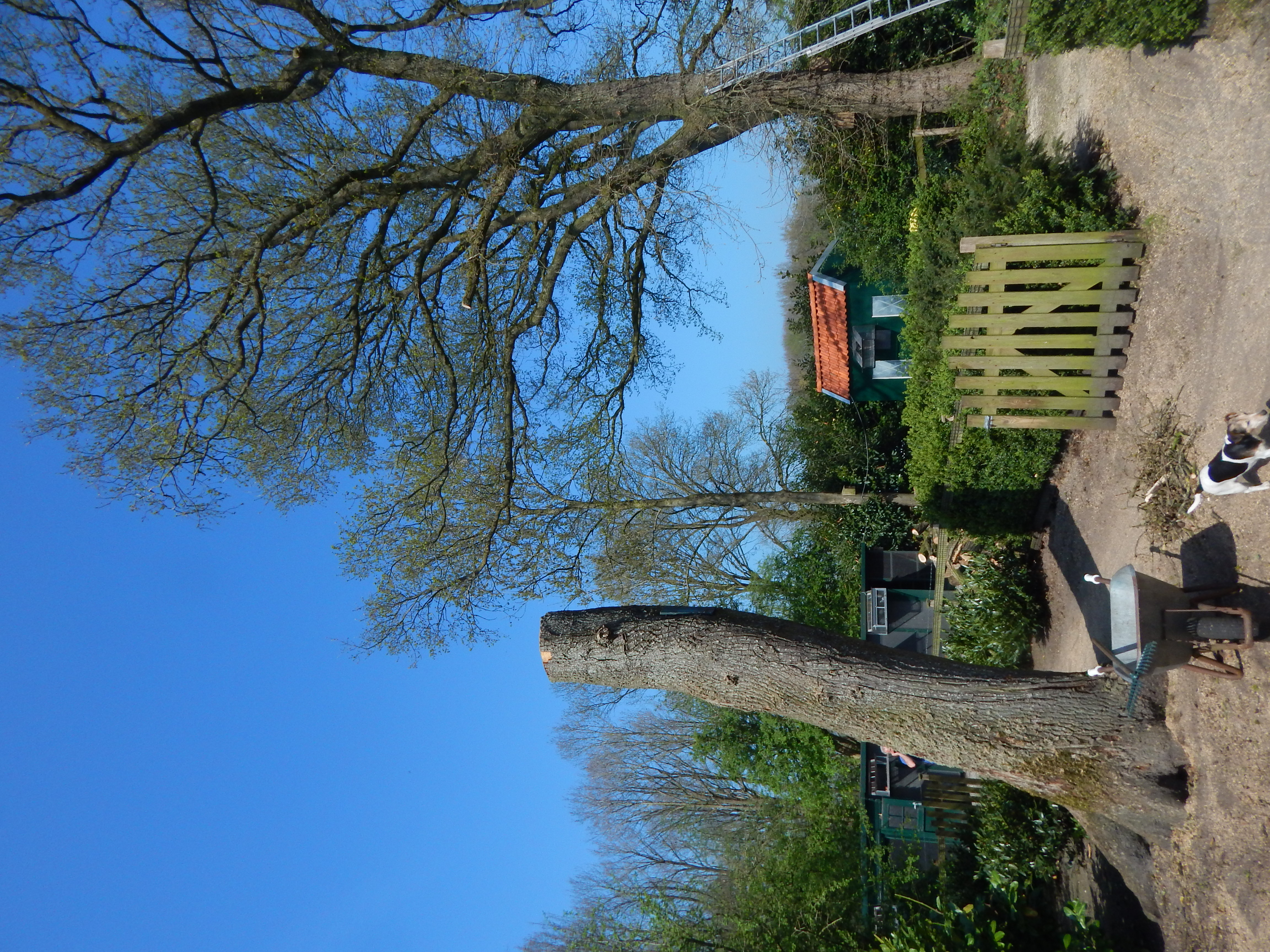 Bij de 2e eik waar de ladder tegen aan staat hebben we een aantal takken ingekort. Hierdoor hebben we de aanvlieg route voor de duiven makkelijker gemaakt. Bij de eerste eik op de voorgrond hebben we alle takken weg gehaald. Hier zat gedeeltelijk rotting in. Het stuk stam wat is blijven staan word gebruikt om een beeld van te maken door middel van carving met een kettingzaag.